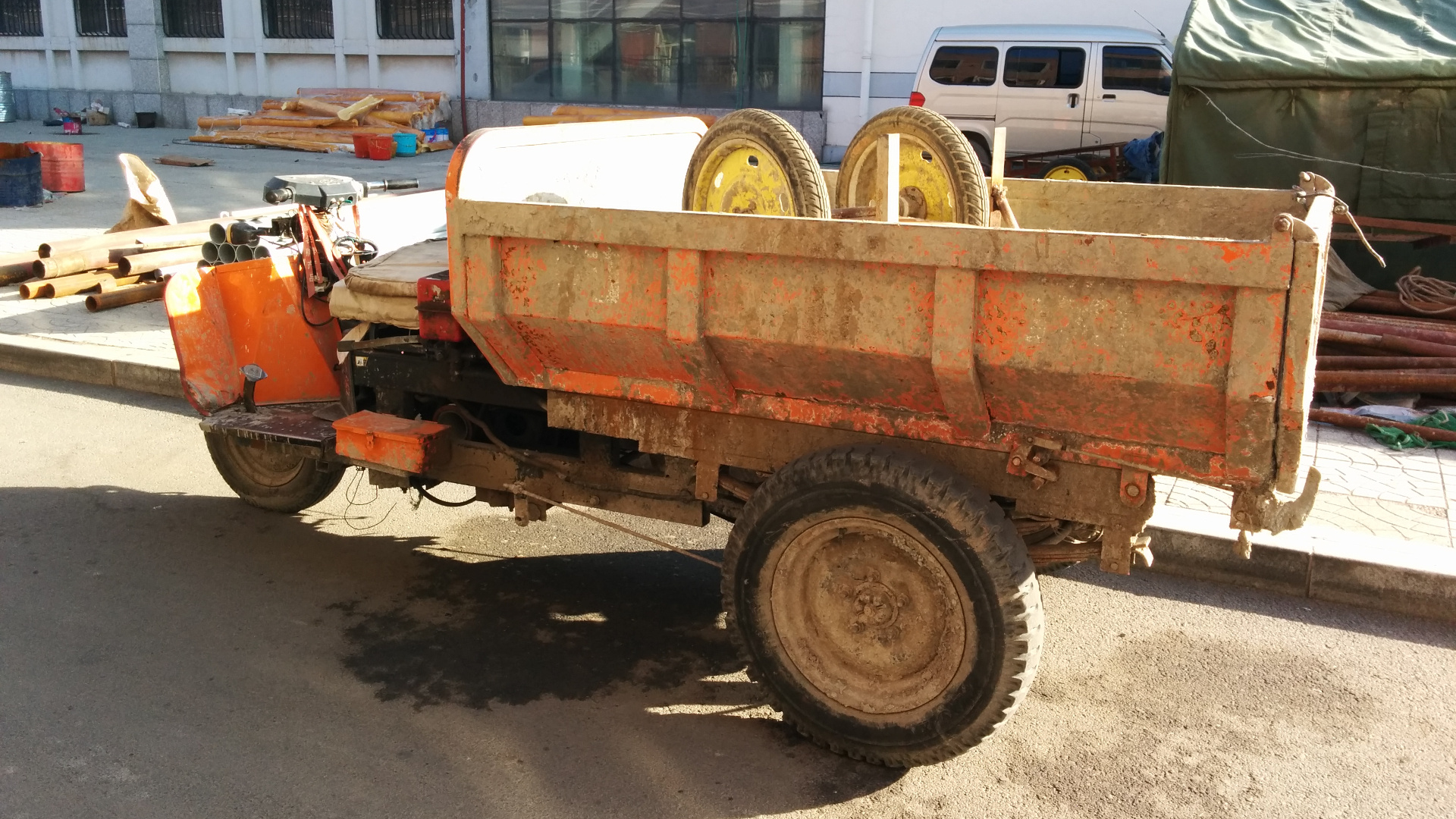 And finally, this dump trike is being used in our neighborhood’s re-insulation project. Though mostly empty at the moment, it was later spotted with a full load of concrete.